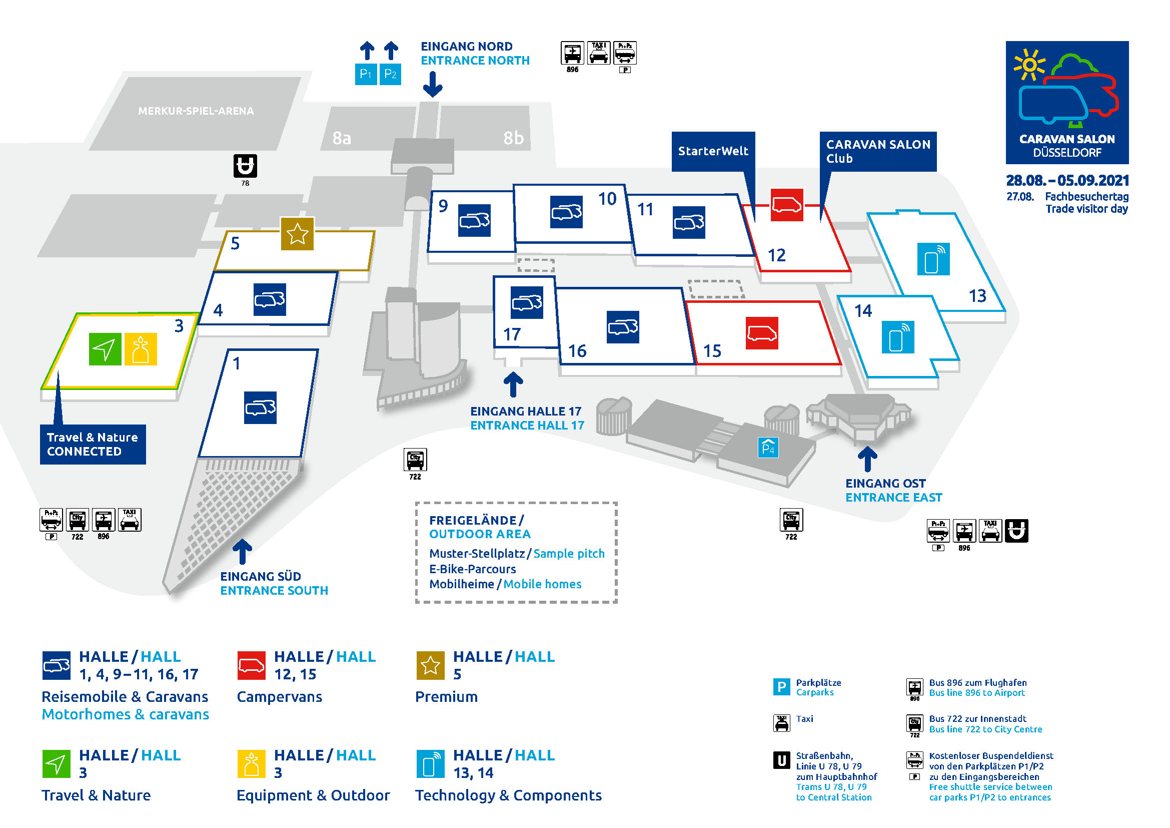 Poprvé se do veletrhu zapojí hala číslo 3, ve které najdete vybavení pro outdoor a kemping spolu s výrobci stanů a markýz. V halách 13 a 14 najdete nově kompletní techniku a vybavení vozidel. Zajímavé budou haly 12 a 15, jež budou věnovány výhradně obytným vestavbám. V hale 5 budou prémiová luxusní obytná vozidla. Obytné automobily a karavany pak najdete v halách 1, 4, 9, 10, 11, 16 a 17.